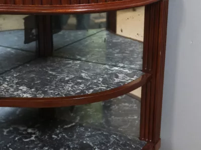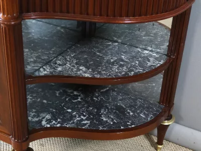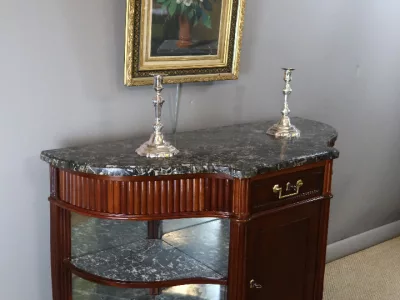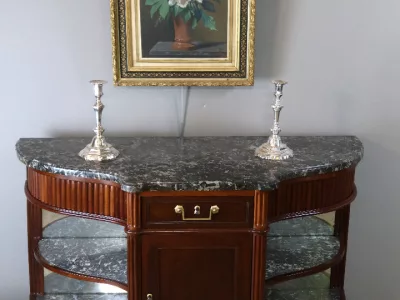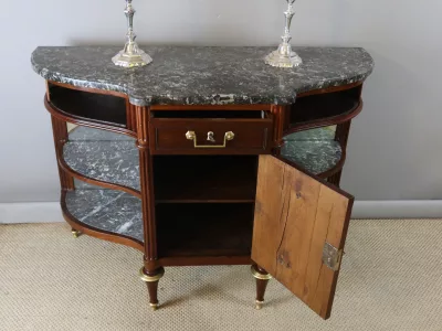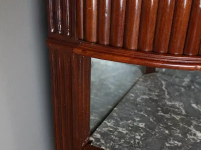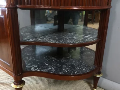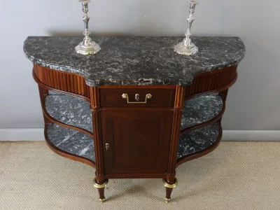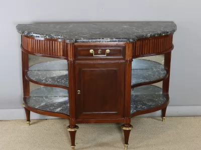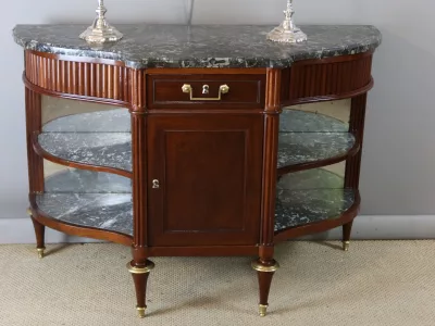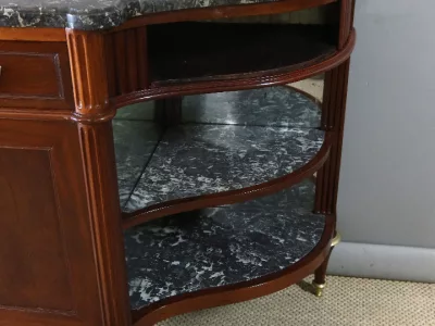 Aparador Luis XVI de caoba con cubierta de mármol. Puerta y cajón centrales, estantes laterales con cubierta de mármol y respaldo de espejo. Restaurado y repulido a la francesa. Contáctenos para su entrega.