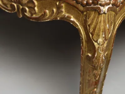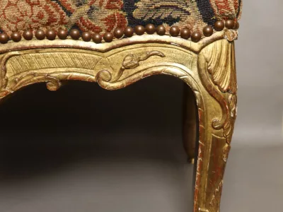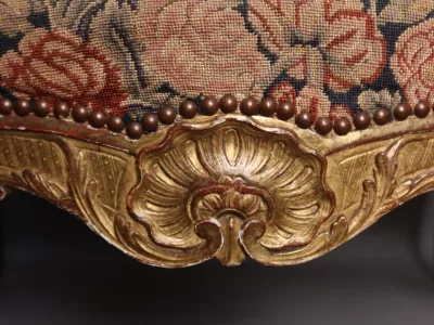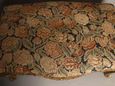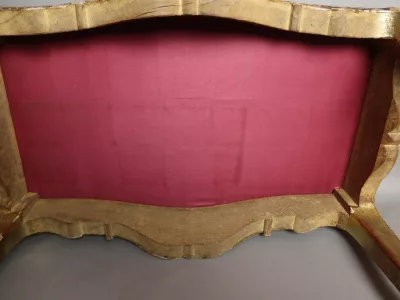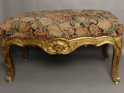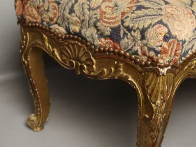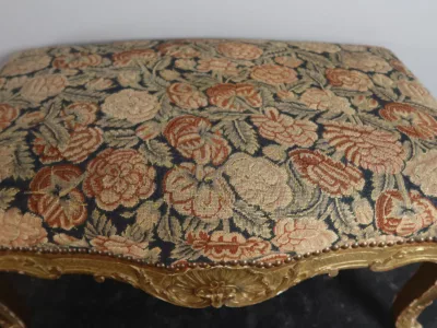 Taburete de madera tallada y dorada, estilo Luis XV, de finales del siglo XIX. Contáctenos para su entrega.