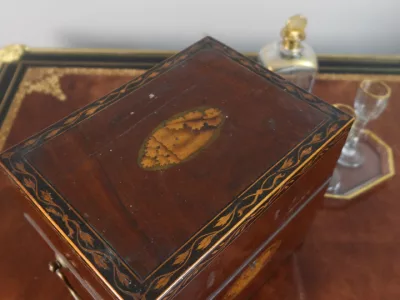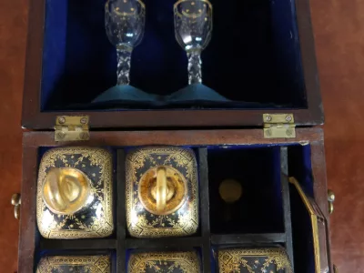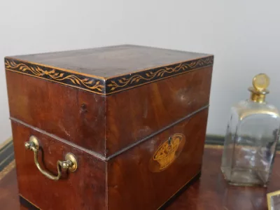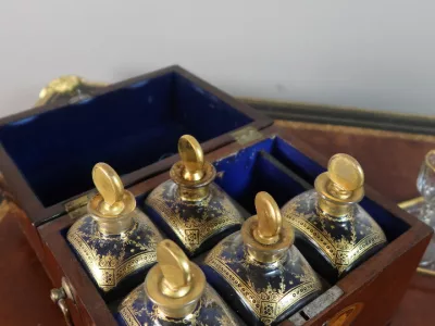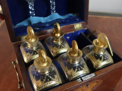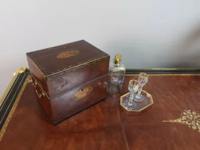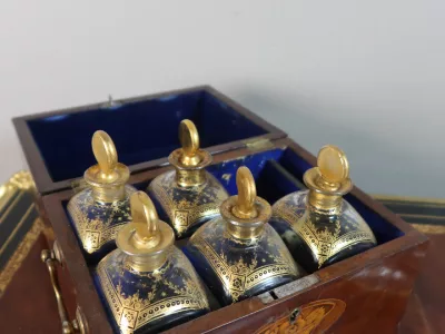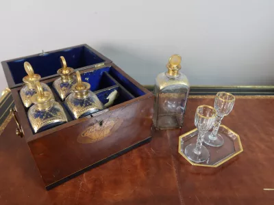 Caja decantadora con cinco decantadores, dos copas y una bandeja con decoración dorada. La caja es de marquetería con dos asas laterales de latón. Contáctenos para su entrega.