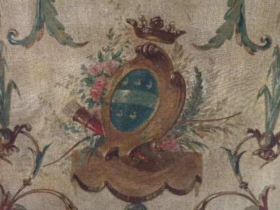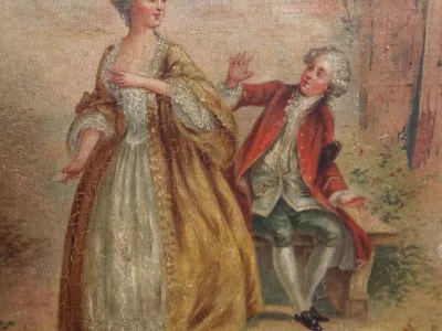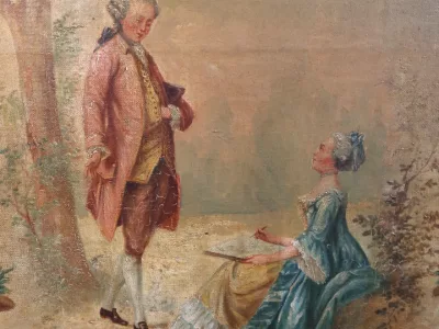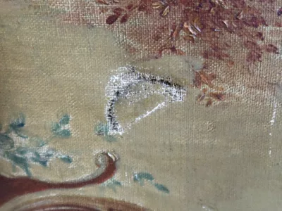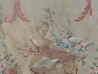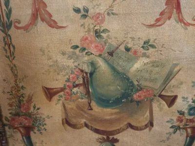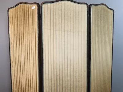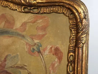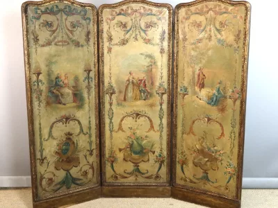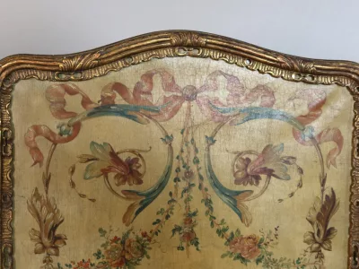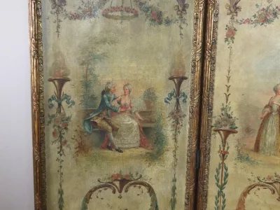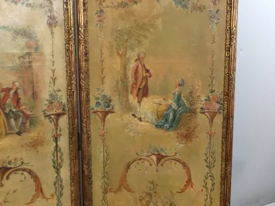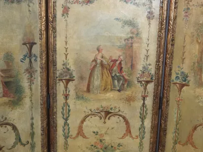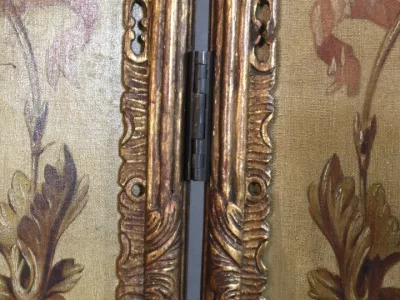 Biombo de tres paneles de finales del siglo XVIII en madera dorada con pinturas al óleo sobre lienzo en una cara y la seda plisada original en el reverso. Buen estado general, a pesar de un pequeño desgarro en el lado derecho (ver foto). Contáctenos para la entrega.