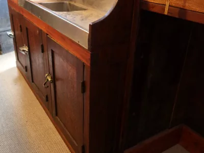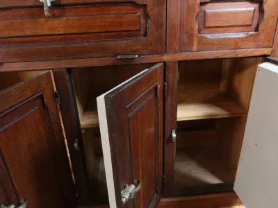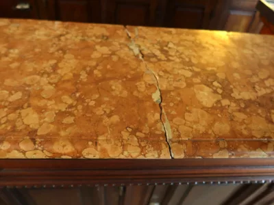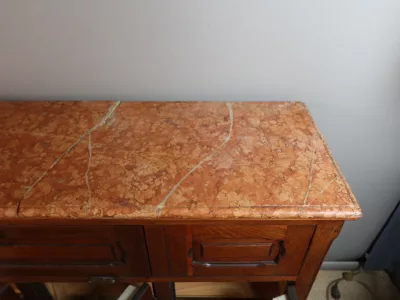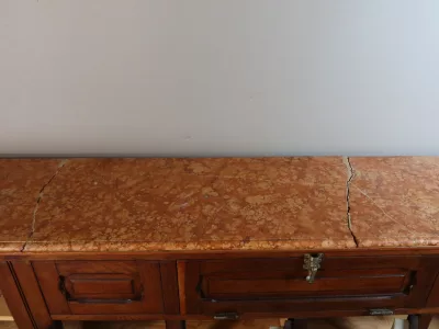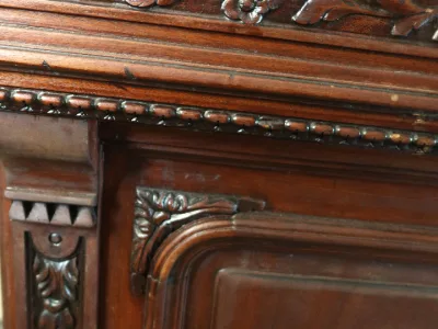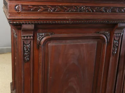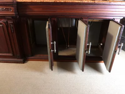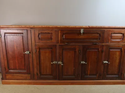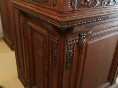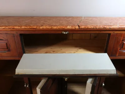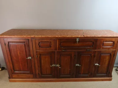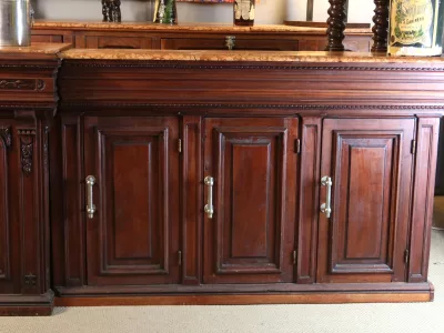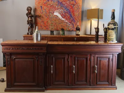 Gran barra de bar de roble tallado con su mueble trasero. Finales del siglo XIX. Estado original, necesita restauración. Ambos mármoles están dañados. Contáctenos para la entrega.