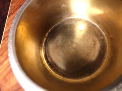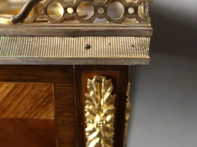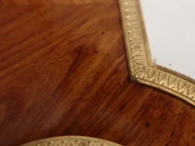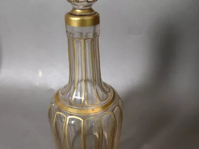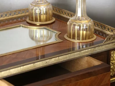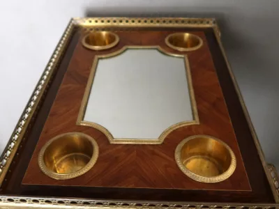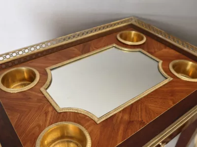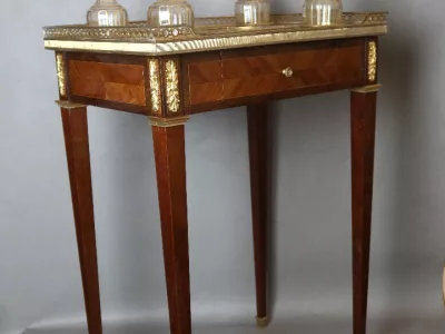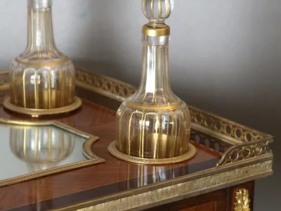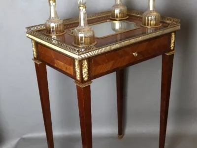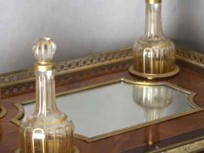 Mesa del siglo XIX, estilo Luis XVI, con cuatro decantadores dorados de Boin-Tabouret. Contáctenos para su entrega.