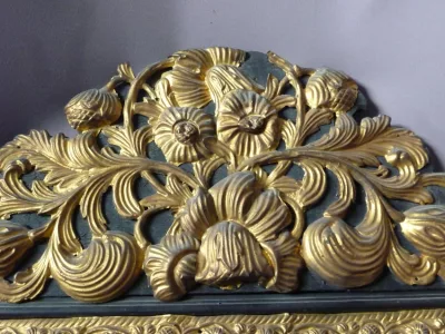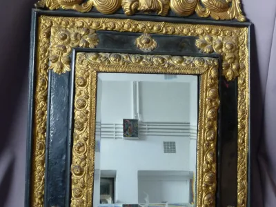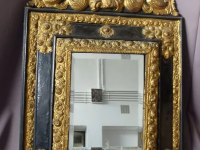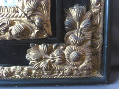 Espejo de estilo Luis XIII en madera y latón repujado